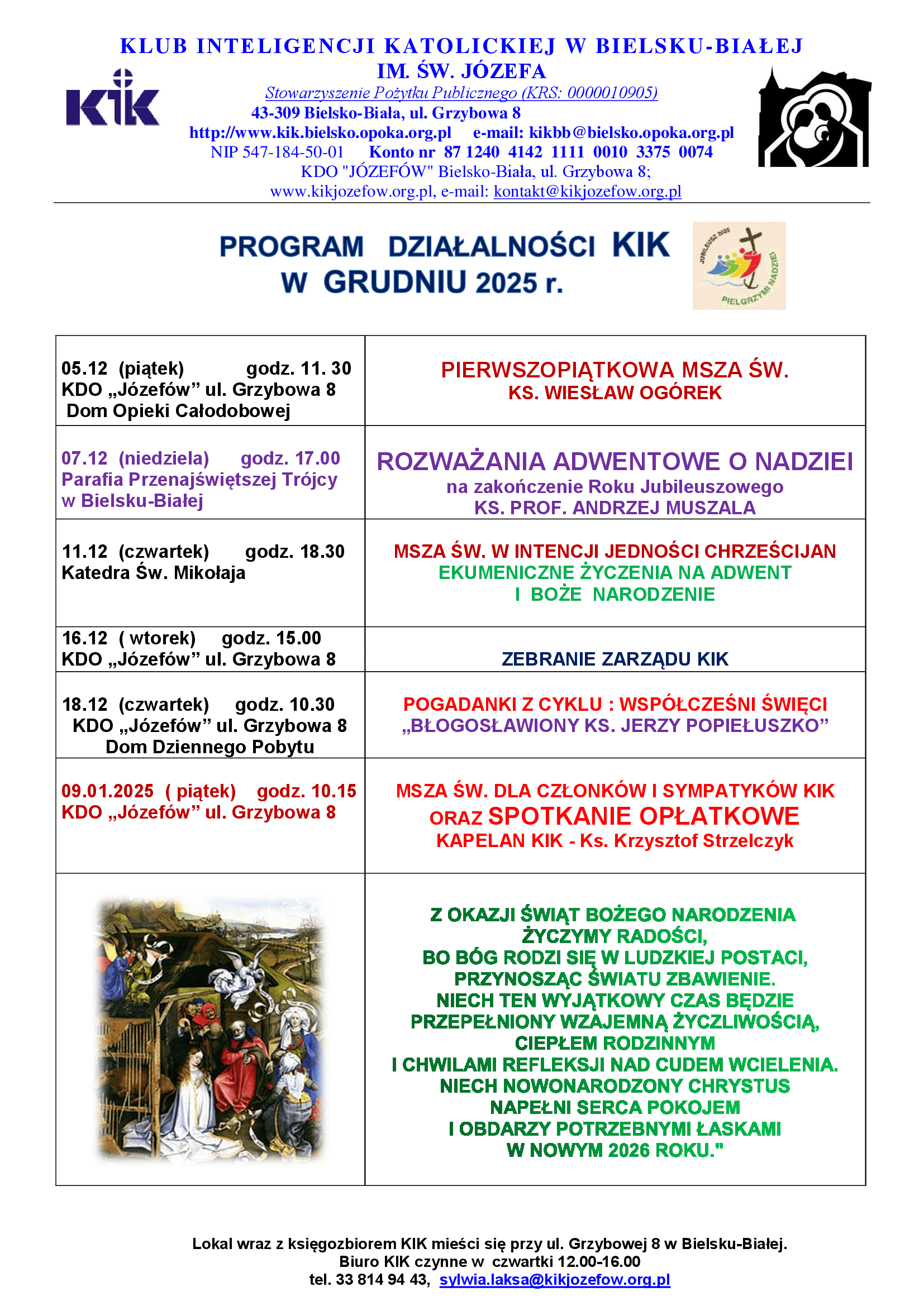 gru 02 2025 Wyłączono program KIK na grudzień 2025 przez Darek Nawigacja wpisu Poprzedni wpisPoprzedni program KIK na listopad 2025Następny wpisNastępne Zaproszenie na rekolekcje adwentowe